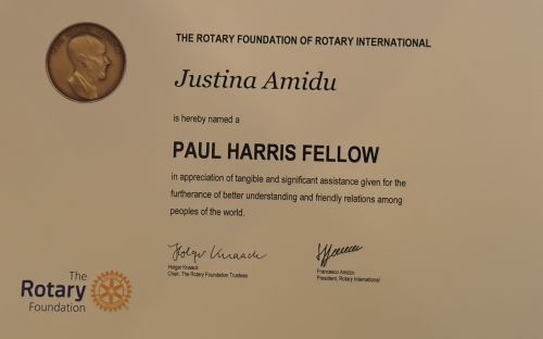 Paul Harris Fellow På årets julemøte 8. desember 2025 ble Justina Amidu hedret med æresbevisningen Paul Harris Fellow, som er opprettet av Rotary International, for den enorme innsatsen Justina har utført. I nesten to tiår har hun vært sentral i å fremme klubbens prosjekter i landsbyen Weisi i Ghana. Gjentatte ganger har hun fremmet initiativer som er blitt gjennomført med suksess, som å bore vannbrønner, sørge for belysning, utstyr og datamaskiner til den lokale skolen, utvide lekeplassen til barnehagen og anskaffe medisinsk utstyr til landsbyens helseklinikk, alt finansiert på en rimelig måte av Trondheim Internasjonale Rotary-klubb. hun har utført dette arbeidet på en utmerket måte; alle økonomiske bidrag har gått direkte til de tiltenkte formålene, og alt er blitt korrekt regnskapsført. Bildet viser Justina med PHF medaljen og president Jan Strand. | ![]() | ![]() |